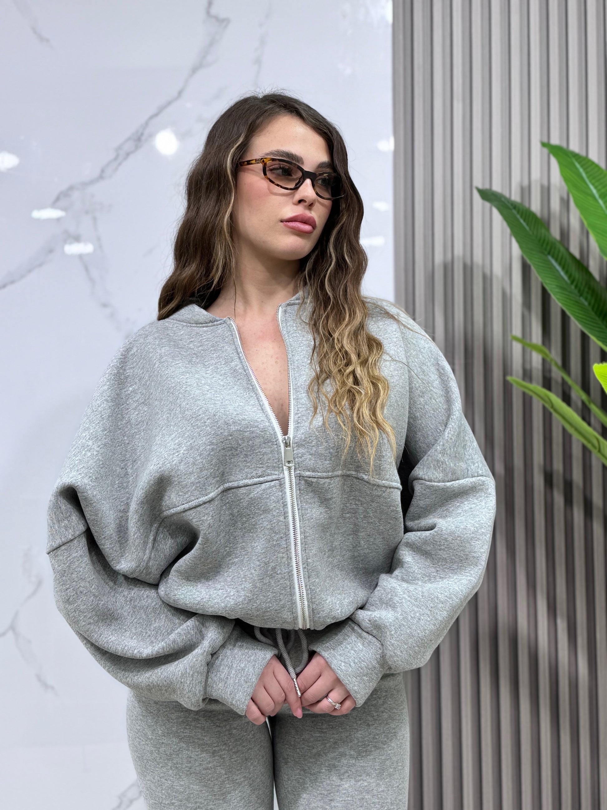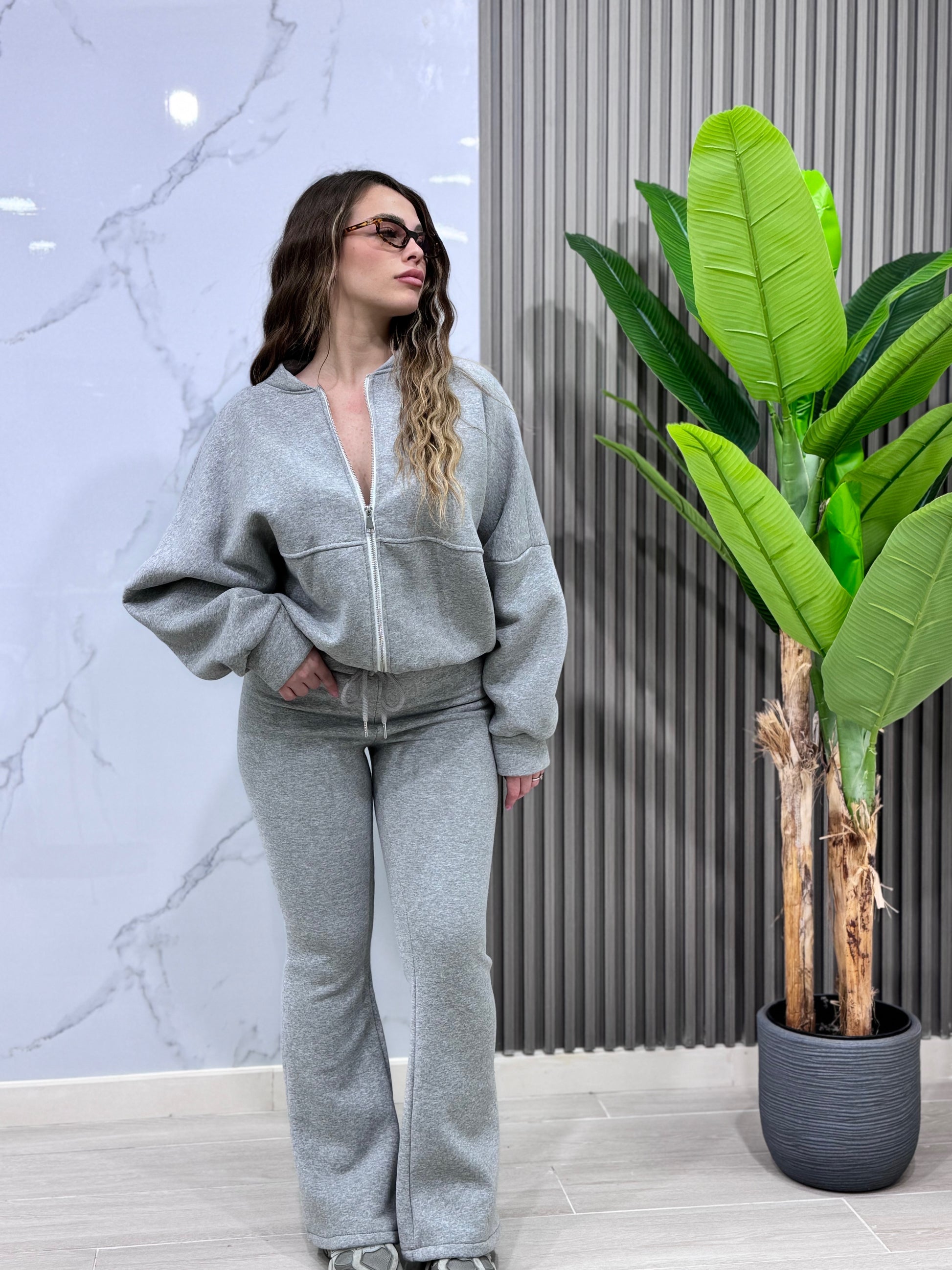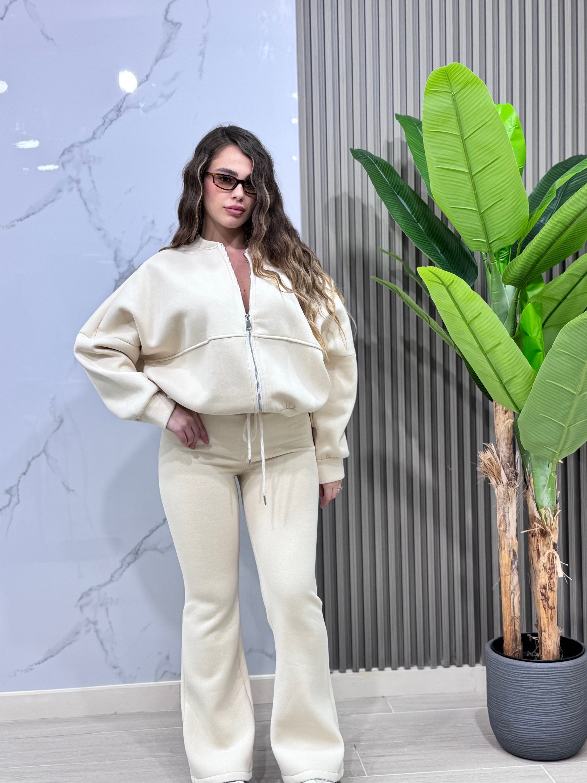 Comodità pura con la TUTA JOLLY! Il pantalone con laccio ti permette di regolare la vestibilità a tuo piacimento, scendendo in una zampa che fa tendenza. La felpa morbida con cerniera gioca con volumi e contrasti, creando un effetto largo-stretto che valorizza la silhouette. Un'armonia di stile e praticità che non potrai più abbandonare.